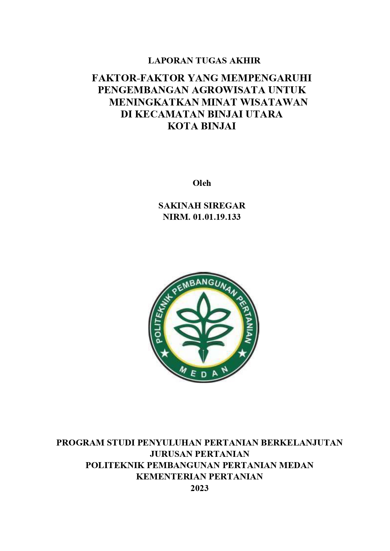 Sakinah Siregar, Nirm. 01.01.19.133. Faktor-Faktor Yang Mempengaruhi Pengembangan Agrowisata Untuk Meningkatkan Minat Wisatawan Di Kecamatan Binjai Utara Kota Binjai. Pengkajian ini bertujuan untuk mengetahui faktor-faktor apa saja yang mempengaruhi minat kunjungan wisatawan yang berkunjung ke lokasi agrowisata tersebut. Pengkajian ini dilaksanakan di Kecamatan Binjai Utara Kota Binjai di berbagai 3 lokasi agrowisata yaitu Padi Bollank, Sawah Lukis, dan Kakuta yang dilaksanakan pada 17 April 2023 sampai 31 Mei 2023. Metode pengkajian yang digunakan adalah analisis kuantitatif dengan pengumpulan data menggunakan kuesioner dan wawancara dengan responden. Sampel pengkajian sebanyak 88 wisatawan yang merupakan pengunjung dari berbagai 3 lokasi agrowisata, dengan penarikan sampel pengkajian yaitu menggunakan accidental sampling. Analisis tingkat respon wisatawan terhadap pengembangan agrowisata diukur dengan teknik penentuan skor model likert. Analisis faktor–faktor yang mempengaruhi respon petani terhadap pengembangan agrowisata yaitu digunakan model analisis regresi linear berganda. Hasil pengkajian secara keseluruhan didapatkan hasil analisis persentase tingkat minat kunjungan wisatawan yaitu sebesar 83% pada kategori tinggi (menerima). Faktor-faktor yang berpengaruh sangat nyata terhadap minat wisatawan adalah sarana dan prasarana dan atraksi wisata. Sedangkan faktor faktor yang berpengaruh nyata adalah aksesibilitas dan lingkungan sosial.