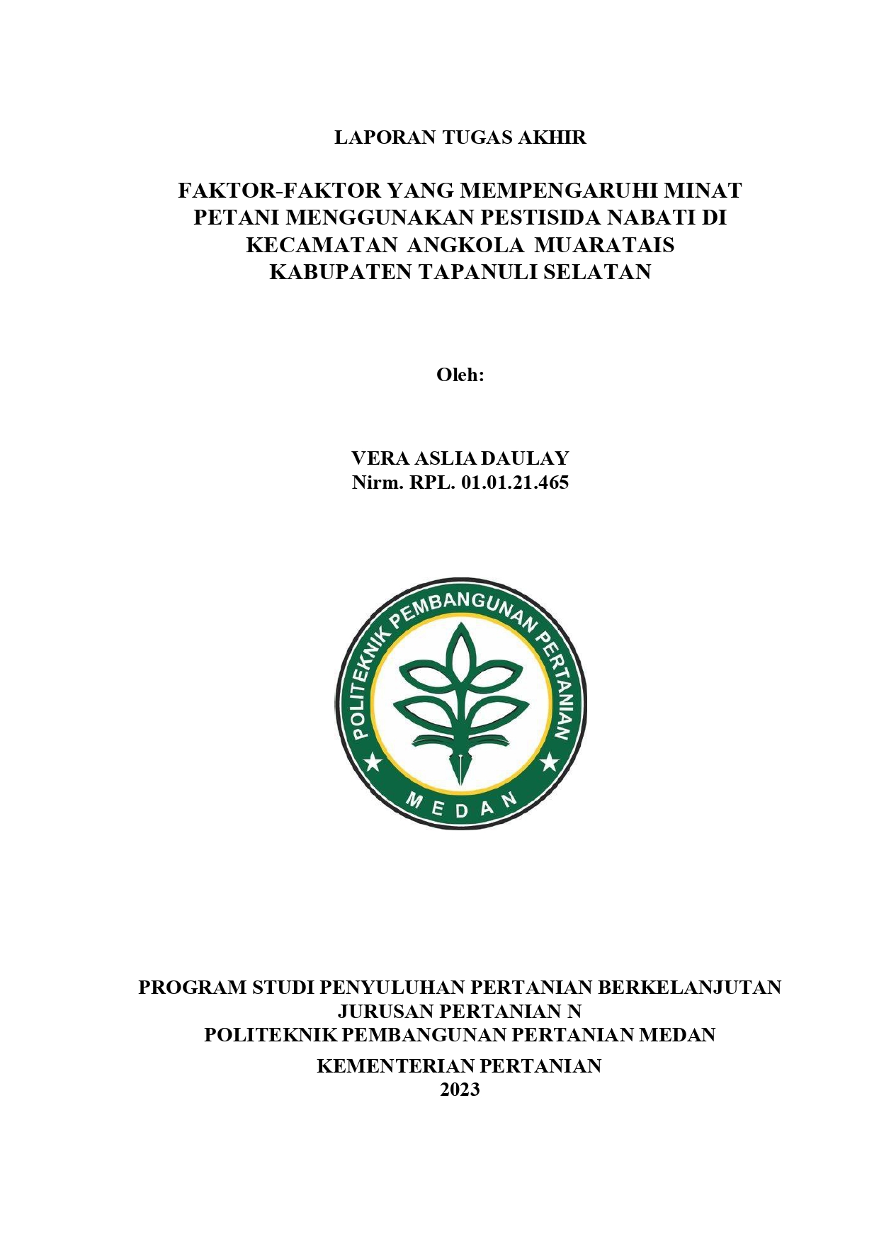 Vera Aslia Daulay, Nirm. 01.01.21.465. Faktor-Faktor Yang Mempengaruhi Minat Petani Menggunakan Pestisida Nabati Di Kecamatan Angkola Muaratais Kabupaten Tapanuli Selatan. Tujuan penelitian ini adalah untuk mengetahui tingkat minat petani menggunakan pestisida nabati di Kecamatan Angkola Muaratais Kabupaten Tapanuli Selatan dan mengetahui umur, pendidikan, pendapatan, peran penyuluh, luas lahan dan pengalaman usahatani. Jenis pengkajian ini adalah deskriptif kuantitatif dengan metode pengumpulan data dengan menggunakan metode observasi, wawancara dan kuisioner. Populasi pengkajian berjumlah 312 dan sampel 76 orang responden. Penentuan sampel menggunakan Purposive Sampling. Metode analisis data menggunakan skla likert dan regresi linear berganda. Hasil analisis pengkajian bahwa minat petani menggunakan pestisida nabati di Kecamatan Angkola Muaratais tergolong tinggi dengan persentase 62,10%. Dan hasil regresi linear berganda terdapat pengaruh signifikan terhadap variabel umur nilai thitung (5.581) > ttabel (1.994) pendidikan nilai thitung (6.251) > ttabel (1.994), pendapatan nilai thitung (2.680) > ttabel (1,994), peran penyuluh thitung (2.024) > ttabel (1.994)