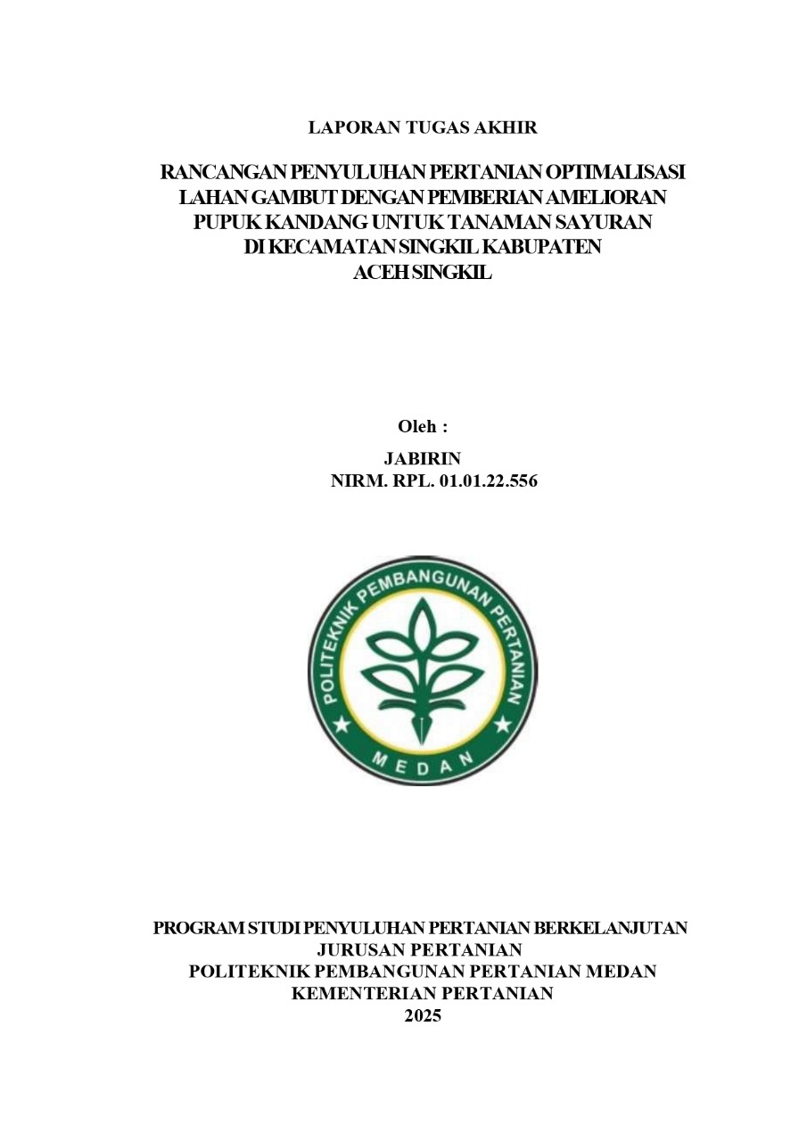 Jabirin, Nirm. RPL. 01.01.22.556. Rancangan Penyuluhan Optimalisasi Lahan Gambut Dengan Pemberian Amelioran Pupuk Kandang Untuk Tanaman Sayuran Di Kecamatan Singkil Kabupaten Aceh Singkil. Tujuan dari pengkajian ini adalah untuk mendesain rancangan penyuluhan (sasaran, tujuan, materi, metode, media, volume, lokasi, waktu, biaya) dan menganalisis efektivitas rancangan penyuluhan optimalisasi lahan gambut dengan pemberian amelioran pupuk kandang untuk tanaman sayuran di Kecamatan Singkil Kabupaten Aceh Singkil . Pengkajian ini dilaksanakan pada bulan November 2024 sampai dengan Januari 2025. Metode pengumpulan data yang digunakan terdiri dari metode observasi, wawancara dan kuesioner yang telah diuji validitas dan reliabilitasnya. Metode analisis data yang digunakan yaitu analisis deskriptif kuantitatif . Hasil pengkajian menunjukkan bahwa tingkat efektivitas rancangan penyuluhan pertanian optimalisasi lahan gambut dengan pemberian amelioran pupuk kandang untuk tanaman sayuran di Kecamatan Singkil Kabupaten Aceh Singkil berada pada kategori sangat efektif dengan perolehan skor persentase sebesar 80,2%.