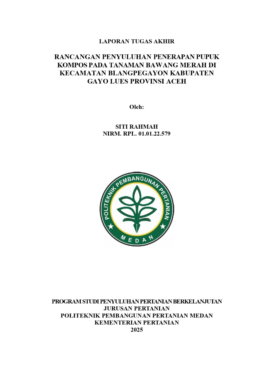 SITI RAHMAH, NIRM. RPL. 01.01.22.579. Rancangan Penyuluhan Penerapan Pupuk Kompos Pada Tanaman Bawang Merah di Kecamatan Blangpegayon Kabupaten Gayo Lues Provinsi Aceh. Penelitian ini bertujuan untuk merancang program penyuluhan yang efektif dalam meningkatkan pengetahuan, keterampilan, dan adopsi petani bawang merah di Kecamatan Blangpegayon, Kabupaten Gayo Lues, Provinsi Aceh, terkait dengan pembuatan dan penerapan pupuk kompos. Rancangan penyuluhan ini meliputi analisis kebutuhan petani melalui survei dan diskusi kelompok. Materi penyuluhan yang akan disampaikan mencakup pengertian, manfaat, cara pembuatan, dosis dan waktu aplikasi pupuk kompos pada tanaman bawang merah, serta studi kasus keberhasilan petani yang telah menerapkan pupuk kompos. Metode penyuluhan yang direncanakan meliputi ceramah interaktif, demonstrasi pembuatan kompos, praktik aplikasi di lahan, kunjungan lapangan ke petani sukses, serta penggunaan media penyuluhan yang relevan seperti leaflet. Evaluasi keberhasilan penyuluhan akan dilakukan melalui pre-test dan post-test untuk mengukur peningkatan pengetahuan, serta observasi dan wawancara untuk mengetahui tingkat adopsi dan dampak penerapan pupuk kompos terhadap produktivitas dan kualitas bawang merah.Hasil pengukuran validasi penerimaan rancangan penyuluhan pertanian menunjukkan bahwa tingkat penerimaan terhadap Rancangan Penyuluhan penggunaan pupuk kompos pada tanaman bawang merah di kecamatan Blangpegayoen mencapai 81,6%, yang berada dalam kategori sangat efektif.