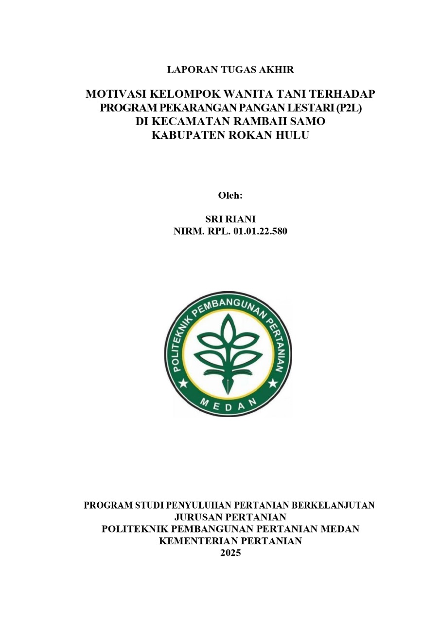 Sri Riani, NIRM. RPL. 01.01.22.580. Motivasi Kelompok Wanita Tani Terhadap Program Pekarangan Pangan Lestari (P2L) di Kecamatan Rambah Samo Kabupaten Rokan Hulu. Pengkajian bertujuan (1) Untuk menganalisis motivasi kelompok wanita tani terhadap Program Pekarangan Pangan Lestari (P2L) Di Kecamatan Rambah Samo Kabupaten Rokan Hulu, (2) Untuk menganalisis faktor-faktor yang mempengaruhi motivasi kelompok wanita tani terhadap Program Pekarangan Pangan Lestari (P2L) Di Kecamatan Rambah Samo Kabupaten Rokan Hulu. Pengkajian ini dilaksanakan di Kecamatan Rambah Samo pada bulan Juli 2024. Metode pengumpulan data yang digunakan adalah wawancara dan penyebaran kuesioner yang telah di uji validitas dan reliabilitasnya, sementara metode analisis data menggunakan skala likert dan regresi linear berganda. Hasil pengakjian menunjukkan bahwa : (1) Tingkat motivasi petani terhadap Program Pekarangan Pangan Lestari (P2L) di Kecamatan Rambah Samo Kabupaten Rokan Hulu sebesar 79,71%, yang termasuk kedalam kategori tinggi, (2) Secara bersamaan (simultan) variabel Karakteristik Petani (X1), Ketersediaan Sarana dan Prasarana (X2), Peran Penyuluh (X3), dan Peran Kelompoktani (X4) memiliki dampak yang signifikan terhadap Motivasi wanita tani terhadap Program Pekarangan Pangan Lestari (P2L) di Kecamatan Rambah Samo Kabupaten Rokan Hulu. Secara individual (parsial), variabel karakteristik petani (X1) signifikan terhadap terhadap Program Pekarangan Pangan Lestari (P2L) di Kecamatan Rambah Samo Kabupaten Rokan Hulu, sedangkan Variabel Ketersediaan Sarana dan Prasarana (X2) tidak memberikan pengaruh signifikan terhadap motivasi petani dikarenakan memiliki nilai Thitung (-1,208) < Ttabel (1,67). Dengan persamaan regresi Y = 32.841 + 0.011 X1 - 0.101 X2 + 0.045X3 + 0.013 X4 + e dan nilai R Square sebesar 0,607.