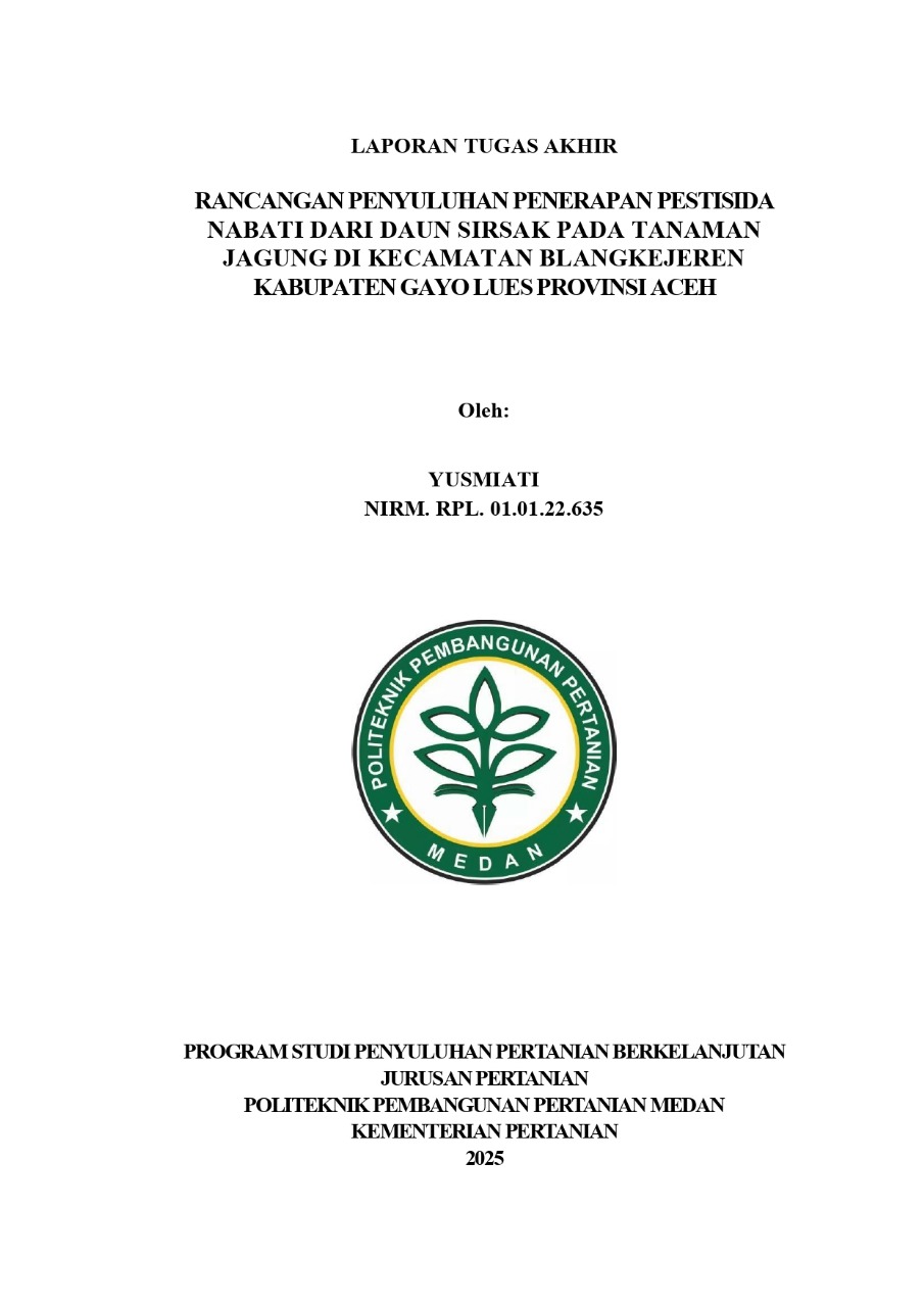 Yusmiati, NIRM. RPL. 01.01.22.635 Penelitian ini bertujuan untuk merancang penyuluhan penerapan pestisida nabati dari daun sirsak pada tanaman jagung di Kecamatan Blangkejeren Kabupaten Gayo Lues Provinsi Aceh. Pestisida nabati dari daun sirsak telah terbukti efektif dalam mengendalikan hama tanaman jagung, namun pengetahuan dan kesadaran petani tentang penggunaan pestisida nabati masih rendah. Oleh karena itu, perlu dilakukan penyuluhan untuk meningkatkan pengetahuan dan kesadaran petani tentang penerapan pestisida nabati dari daun sirsak. Rancangan penyuluhan ini menggunakan metode penyuluhan partisipatif dengan melibatkan petani sebagai subjek utama. Materi penyuluhan meliputi pengenalan pestisida nabati dari daun sirsak, cara pembuatan, dan cara aplikasinya pada tanaman jagung. Penyuluhan ini juga melibatkan demonstrasi lapangan untuk meningkatkan pemahaman petani tentang penerapan pestisida nabati. Dengan adanya rancangan penyuluhan ini, diharapkan petani di Kecamatan Blangkejeren Kabupaten Gayo Lues Provinsi Aceh dapat meningkatkan pengetahuan dan kesadaran tentang penerapan pestisida nabati dari daun sirsak pada tanaman jagung, sehingga dapat meningkatkan produksi jagung yang berkelanjutan dan ramah lingkungan.