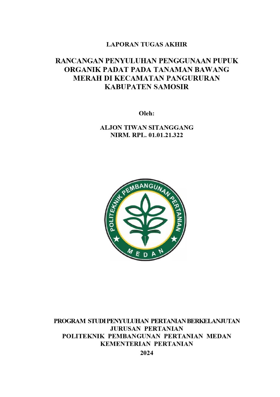 Aljon Tiwan Sitanggang, NIRM. RPL. 01.01.21.322 Rancangan Penyuluhan Penggunaan Pupuk Organik Padat Pada Tanaman Bawang Merah. Tujuan dari penelitian ini adalah untuk menyusun desain rancangan tentang penggunaan pupuk organik dan untuk menganalisis tingkat penerimaan sasaran terhadap rancangan penyuluhan penggunaan pupuk organik padat pada tanaman bawang merah. Penelitian ini dilaksanakan di Kecamatan Pangururan Kabupaten Samosir pada bulan Juni sampai dengan November 2023. Responden ditentukan dengan teknik Proportional Random Sampling dengan jumlah responden 39 orang. Responden diperoleh dari 3 desa di Kecamatan Pangururan, yaitu Desa Pardugul, Panampangan dan Sitoluhuta. Metode pengumpulan data yaitu metode wawancara, observasi dan penyebaran kuesioner yang telah diuji validitas dan reliabilitasnya. Hasil penelitian menunjukkan bahwa tingkat persentase penerimaan petani terhadap rancangan penyuluhan sebesar 97,23% terletak pada kategori sangat efektif..
