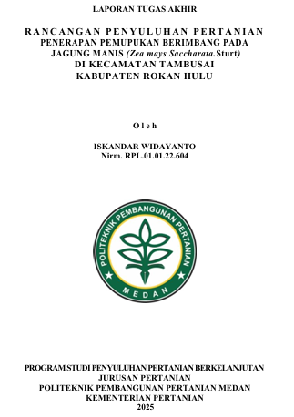 Iskandar Widayanto, Nirm 01.01.22.604. Rancangan penyuluhan pertanian penerapan pemupukan berimbang pada tanaman jagung manis (Zea mays saccharata Sturt). Kajian ini bertujuan untuk merancang suatu penyuluhan pertanian yang sesuai dengan kondisi lokal guna meningkatkan pemahaman dan praktik petani terkait pemupukan berimbang pada tanaman jagung manis (Zea mays Saccharata Sturt) di Kecamatan Tambusai, Kabupaten Rokan Hulu pada bulan September sampai dengan Desember 2024. Latar belakang penelitian ini didasari oleh rendahnya produktivitas jagung manis akibat penerapan pemupukan yang belum optimal oleh petani. Metode penelitian yang digunakan adalah deskriptif dengan pendekatan kualitatif dan kuantitatif. Data dikumpulkan melalui wawancara, kuesioner, dan observasi lapangan, dengan penentuan responden menggunakan teknik purposive sampling. Rancangan penyuluhan yang disusun mencakup tujuan, sasaran, materi, metode, media, volume, lokasi, waktu, dan biaya penyuluhan. Hasil penelitian menunjukkan bahwa rancangan penyuluhan ini diterima sangat baik oleh petani, dengan tingkat penerimaan mencapai 91,25% dan termasuk dalam kategori sangat efektif. Kegiatan penyuluhan dilakukan melalui metode ceramah, diskusi kelompok, dan demonstrasi lapangan, didukung oleh media leaflet dan presentasi visual. Rancangan ini diharapkan mampu mendorong petani untuk menerapkan prinsip pemupukan berimbang 5T (tepat jenis, dosis, waktu, cara, dan tempat) secara konsisten demi mendukung peningkatan produktivitas serta keberlanjutan budidaya jagung manis.