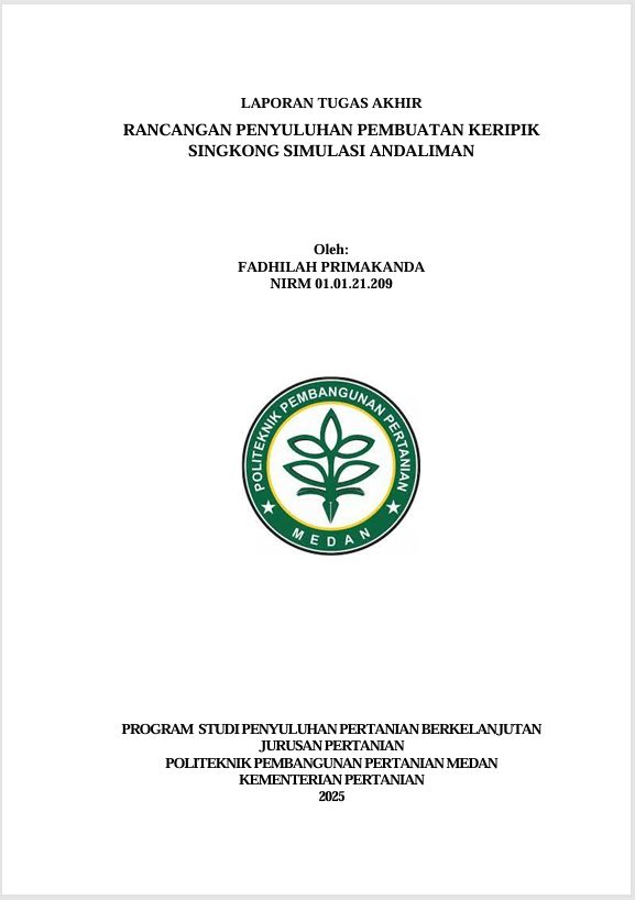 Fadhilah Primakanda, NIRM. 01.01.21.209. Singkong merupakan komoditas pertanian yang memiliki potensi besar untuk dikembangkan menjadi berbagai produk olahan guna meningkatkan nilai tambah dan pendapatan petani. Penelitian ini bertujuan untuk mengetahui pengaruh konsentrasi bumbu andaliman terhadap kualitas dari keripik singkong simulasi, untuk mengetahui persepsi petani terhadap pembuatan keripik singkong simulasi andaliman, dan untuk merancang penyuluhan tentang pembuatan keripik singkong simulasi andaliman yang tervalidasi. Penelitian ini terdiri dari kajian teknis, analisis persepsi petani terhadap inovasi, dan validasi rancangan penyuluhan. Kajian teknis menggunakan metode eksperimental Rancangan Acak Lengkap (RAL) dengan tiga perlakuan konsentrasi bubuk andaliman (1,5%, 2%, dan 2,5%) dan dilakukan pengujian kadar air serta uji organoleptik. Analisis persepsi dilakukan menggunakan metode pendekatan kualitatif dengan melakukan wawancara dan reduksi data. Validasi rancangan penyuluhan dilakukan menggunakan skala likert dengan lima alternatif jawaban yaitu sangat tidak afektif, tidak efektif, sedang, efektif, dan sangat efektif. Penelitian dilakukan dari bulan Maret sampai dengan Juni 2025. Hasil penelitian ini menunjukkan bahwa konsentrasi bubuk andaliman terbaik diperoleh pada konsentrasi 2% yang memiliki cita rasa dan mutu paling disukai panelis. Persepsi terhadap inovasi pembuatan keripik singkong simulasi andaliman tergolong dapat diterima dengan positif. Hasil validasi rancangan penyuluhan menunjukkan tingkat keefektifan rancangan penyuluhan tergolong efektif.