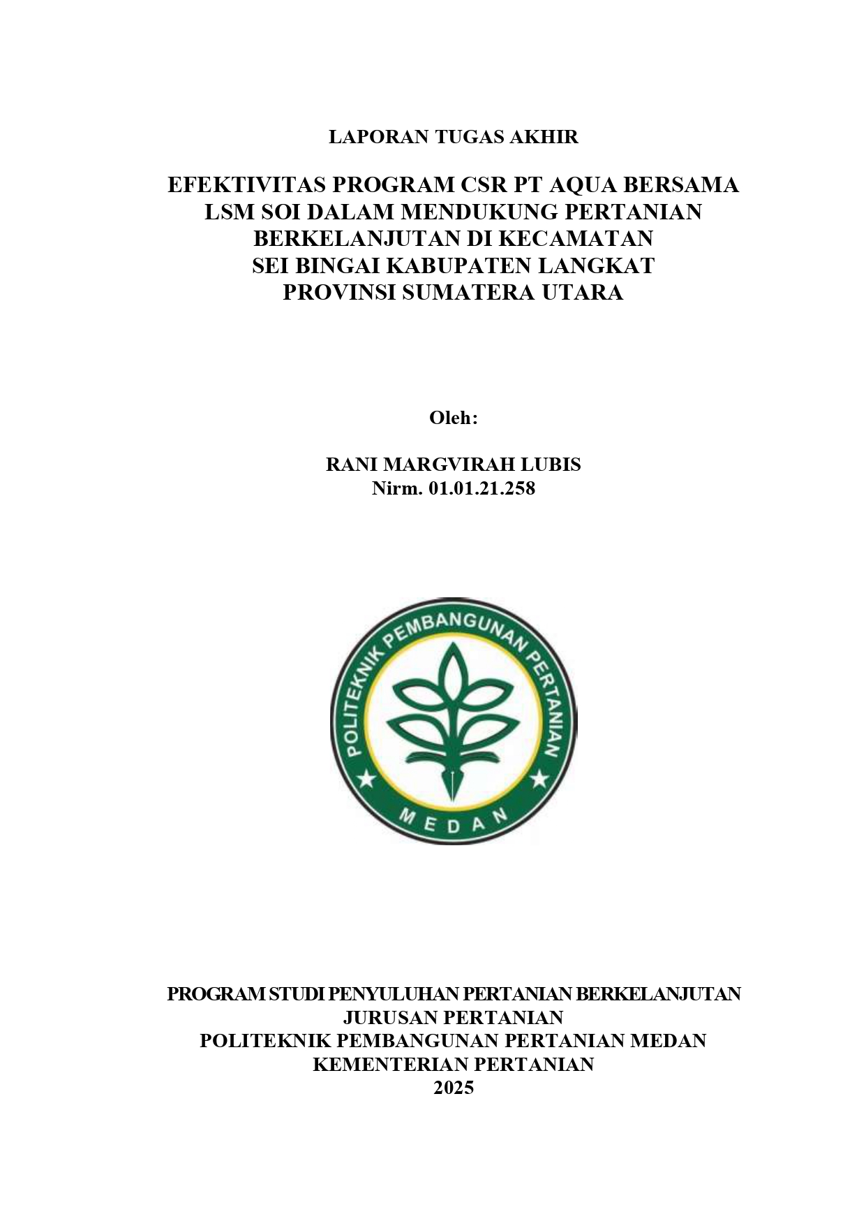 Efektivitas Program CSR PT AQUA Bersama LSM SoI Dalam Mendukung Pertanian Berkelanjutan di Kecamatan Sei Bingai Kabupaten Langkat Provinsi Sumatra Utara.