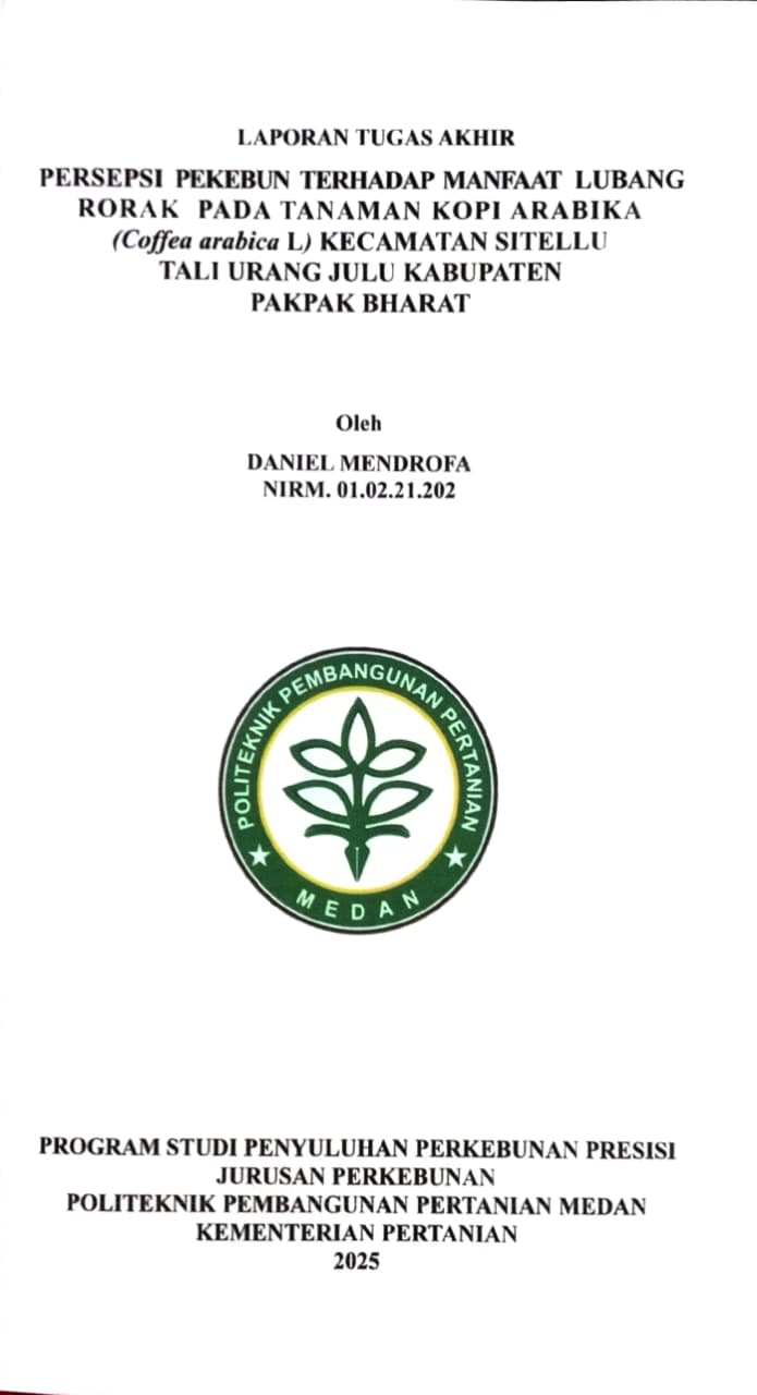 Daniel Mendrofa, Nirm 01.02.21.202. Persepsi Pekebun Terhadap Manfaat Lubang Rorak Pada Tanaman Kopi Arabika (Coffea arabica L) di Kecamatan Sitellu Tali Urang Julu Kabupaten Pakpak Bharat. Tujuan dari pengkajian ini adalah untuk mengkaji tingkat persepsi pekebun dan mengkaji faktor-faktor yang memengaruhi persepsi pekebun terhadap manfaat lubang rorak pada tanaman kopi arabika. Pengkajian dilaksanakan pada bulan Maret hingga Mei 2025 di Kecamatan Sitellu Tali Urang Julu. Jenis pengkajian yang digunakan Deskriptif kuantitatif dengan metode pengumpulan data dilakukan melalui wawancara, observasi, dokumentasi, dan penyebaran kuesioner yang telah diuji validitas dan reliabilitasnya. Sementara metode analisis data menggunakan skala Likert dan Regresi Linear Berganda. Hasil pengkajian menunjukkan bahwa tingkat persepsi pekebun terhadap manfaat lubang rorak berada dalam kategori sedang dengan persentase sebesar 64,52%. hasil regresi linear Berganda terhadap faktor-faktor yang memengaruhi persepsi pekebun diperoleh persamaan sebagai berikut Y = 36.173 - 0.213 X1 + 0.098 X2 + 0.073 X3 + 0.164 X4 - 5.384 X5 – 0.023 X6 + 0.339 X7 + e. Faktor-faktor yang berpengaruh terhadap pesepsi pekebun terhadap manfaat lubang rorak pada tanaman kopi arabika di Kecamatan Sitellu Tali Urang Julu adalah umur, Pendidikan, luas lahan, pengalaman, dan interaksi sosial.