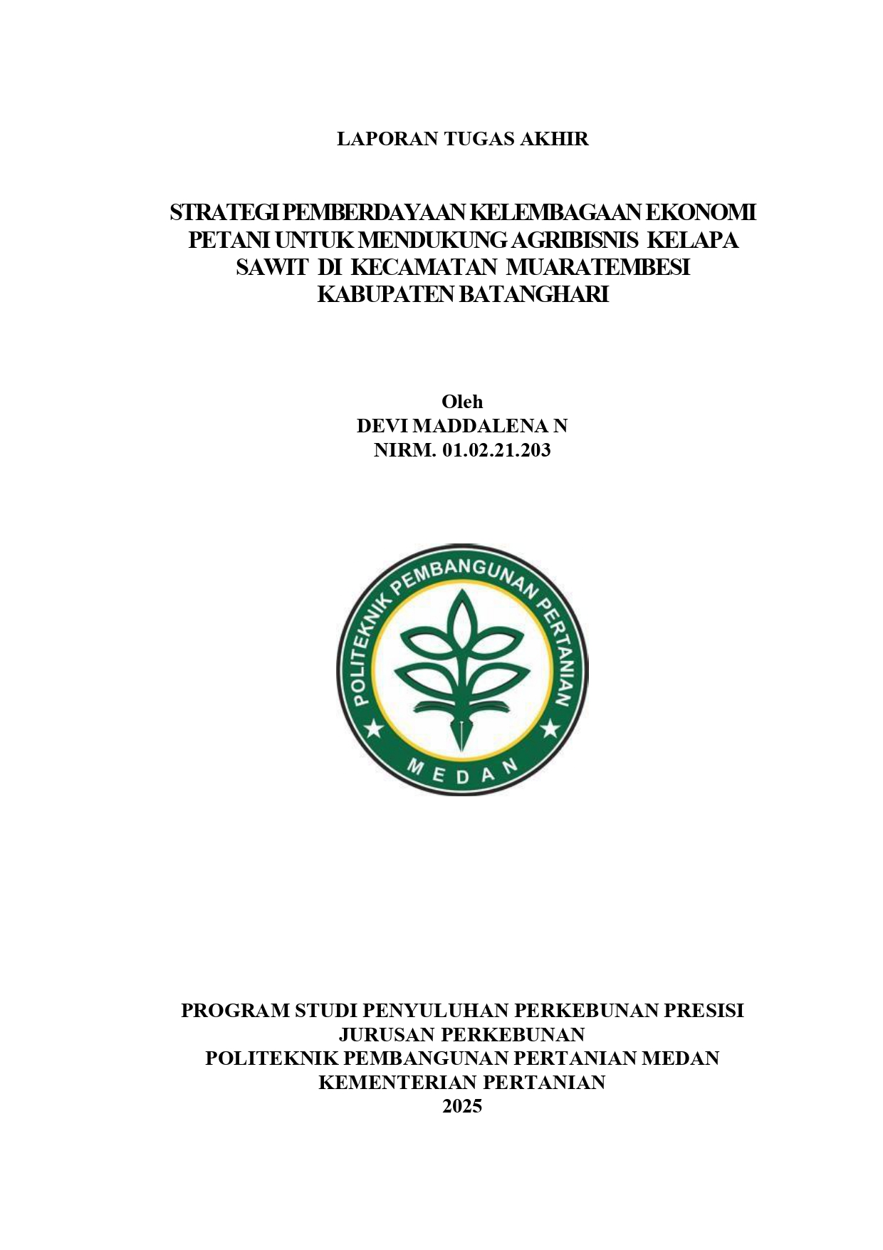 Devi Maddalena, Nirm. 01.02.21.203. Strategi Pemberdayaan Kelembagaan Ekonomi Petani untuk Mendukung Agribisnis Kelapa Sawit. Tujuan dari penkajian ini adalah untuk mengidentifikasi dan menganalisis Potensi Kapasitas Lokal, Pemetaan Stakeholders dan menyusun rumusan strategi Pemberdayaan Koperasi Usaha Bersama di Kecamatan Muara Tembesi Kabupaten Batanghari. Pengkajian dilaksanakan di Kecamatan Muara Tembesi Kabupaten Batanghari pada bulan November sampai dengan Juni 2025. Teknik pengkajian analisis deskriptif kualitatif. Teknik pengumpulan data wawancara mendalam, observasi, FGD, dokumentasi. Teknik analisis data dengan pengumpulan data, reduksi, penyajian data, kesimpulan dan verifikasi. Hasil penelitian menunjukkan Potensi Kapasitas Lokal dilihat dari Aspek Pengetahuan Lokal, Aktor atau Pelaku dan Sistem Sosial, Pemetaan Stakeholders diukur berdasarkan tingkat pengaruh dan kepentingan lalu didapatkan pemetaan Stakeholders ke dalam empat bagian yaitu Subject, Key Player, Context Setter, dan Crowd. Strategi yang diperoleh strategi SO merupakan strategi agresif dengan mengoptimalkan kekuatan (S) untuk memanfaatkan peluang