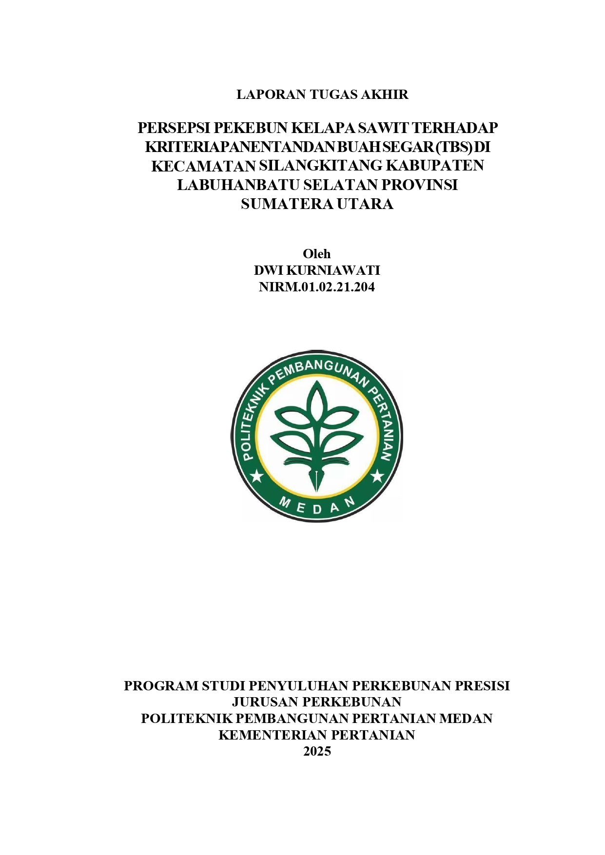 Dwi Kurniawati, Nirm 01.02.21.204. Persepsi Pekebun Kelapa Sawit Terhadap Kriteria Panen Tandan Buah Segar (TBS) di Kecamatan Silangkitang Kabupaten Labuhanbatu Selatan Provinsi Sumatera Utara. Tujuan dari penelitian ialah untuk menganalisis persepsi pekebun kelapa sawit terhadap kriteria panen Tandan Buah Segar (TBS) dan faktor-faktor yang mempengaruhi persepsi pekebun kelapa sawit terhadap kriteria panen Tandan Buah Segar (TBS) di Kecamatan Silangkitang Kabupaten Labuhanbatu Selatan Provinsi Sumatera Utara. Penelitian dilaksanakan bulan Maret sampai bulan Mei 2025. Metode pengkajian yaitu pengkajian kuantitatif. Teknik pengumpulan data yaitu observasi, wawancara dan kuesioner yaitu dengan uji validitas dan reliabilitas. Teknik analisis data menggunakan skala Likert dan regresi linear berganda. Hasil pengkajian menunjukkan bahwa persepsi pekebun kelapa sawit terhadap kriteria panen Tandan Buah Segar (TBS) dalam kategori tinggi yaitu 82,9 %. Berdasarkan hasil regresi linear berganda diperoleh persamaan Y= 4,829 + 0,080X1 + 0,247X2 + 0,286X3 + 0,094X4 – 0,00000002084X5 + 0,191X6 +0,210X7 + 0,89X8 + e. Uji F (Simultan) menunjukkan bahwa variabel-variael bebas umur (X1), pendidikan (X2), luas lahan (X3), pengalaman (X4), pendapatan (X5), peran penyuluh (X6), peran kelompok tani (X7) dan akses informasi (X8) Uji t hitung menunjukkan pengaruh signifikan persepsi pekebun kelapa sawit terhadap kriteria panen tandan buah segar (TBS) adalah umur (X1), pendidikan (X2), pengalaman (X4), peran penyuluh (X6), peran kelompok tani (X7) dan akses informasi (X8). Sedangkan yang tidak p