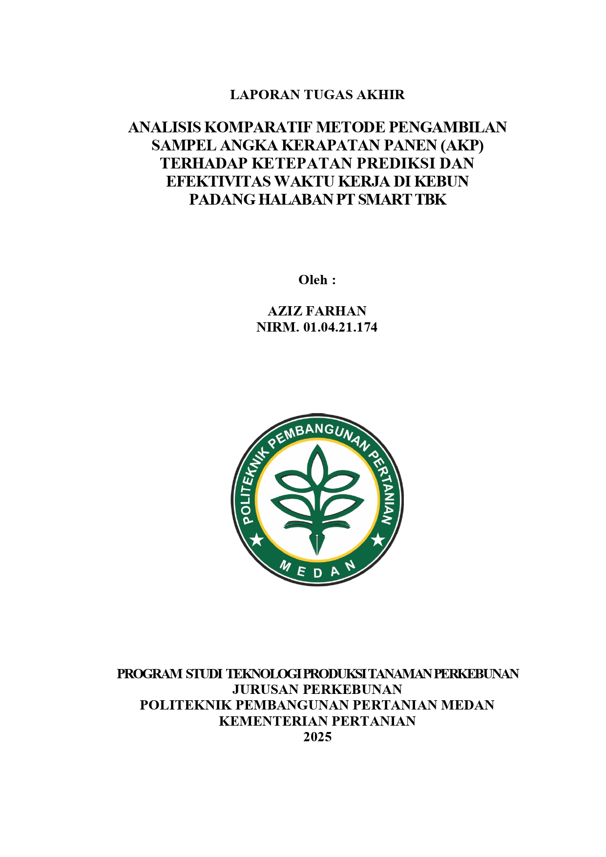Aziz Farhan, Nirm 01.04.21.174. Penelitian ini bertujuan untuk mengkaji Estimasi hasil panen yang akurat melalui Angka Kerapatan Panen (AKP) sangat penting untuk manajemen panen yang efektif di perkebunan kelapa sawit. Penelitian ini membandingkan dua metode sampling AKP—ancak tetap dan ancak acak— berdasarkan akurasi prediksi dan efisiensi waktu di PT SMART Tbk Kebun Padang Halaban. Penelitian dilakukan pada dua blok dengan tahun tanam seragam, masing-masing dengan cakupan 4% dari total pokok produktif dan dua kali pengulangan. Data yang dikumpulkan meliputi taksasi pra-panen, waktu pengambilan sampel, dan hasil panen aktual, dianalisis menggunakan uji T berpasangan dan uji T independen. Hasil menunjukkan bahwa metode ancak tetap lebih akurat (deviasi ≤5%) dan lebih efisien waktu karena penetapan plot yang sistematis. Sebaliknya, metode acak menunjukkan deviasi >10% dan membutuhkan waktu lebih lama. Temuan ini mendukung penerapan metode ancak tetap sebagai pendekatan yang lebih andal dan efisien, serta memberikan dasar untuk standarisasi prosedur AKP dalam mendukung perencanaan sumber daya dan pengambilan keputusan di sistem pertanian kelapa sawit presisi.