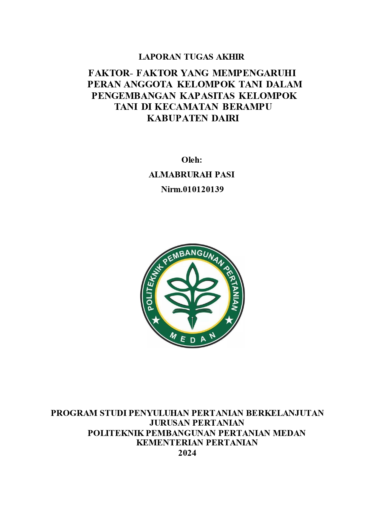 Almabrurah Pasi, Nirm. 01.01.20.139. Faktor-faktor yang mempengaruhi peran anggota kelompok tani dalam pengembangan kapasitas kelompok tani di Kecamatan Berampu Kabupaten Dairi Provinsi Sumatera Utara. Tujuan dari pengkajian ini adalah Untuk menganalisis tingkat peran anggota kelompok tani dalam pengembangan kapasitas kelompok tani di Kecamatan Berampu Kabupaten Dairi dan untuk menganalisis faktor-faktor apa yang mempengaruhi peran anggota kelompok tani dalam pengembangan kapasitas kelompok tani di Kecamatan Berampu Kabupaten Dairi. Pengkajian ini dilaksanakan pada bulan Februari 2024 sampai dengan Juni 2024. Metode pengumpulan data yaitu metode metode kombinasi yang terdiri dari observasi, kuesioner yang sudah diuji validitas dan realibilitasnya, dan wawacara. Sementara metode analisis data menggunakan skala likert dan regresi linear berganda. Hasil pengkajian menunjukkan bahwa tingkat peran anggota kelompok tani dalam pengembangan kapasitas kelompok tani sebesar 84, 18%. Hasil regresi linear berganda terhadap faktor-faktor yang mempengaruhi peran anggota kelompok tani diperoleh persamaan sebagai berikut Y = -5,079 + 0,269X1 + 0,217X2 + 0,283X3 + 0,348X4 + 0,11X5. Secara simultan, variabel tingkat pendidikan, kepemimpinan kelompok tani, modal sosial, peran penyuluh, serta kemitraan kelompok tani berpengaruh secara bersama sama terhadap peran anggota kelompok dalam pengembangan kapasitas kelompok tani. Secara parsial variabel tingkat pendidikan, kepemimpinan kelompok tani, modal sosial, peran penyuluh berpengaruh sangat nyata terhadap peran anggota kelompok tani, sedangkan variabel kemitraan kelompok tani tidak berpengaruh nyata terhadap peran anggota kelompok tani dalam pengembangan kapasitas kelompok tani.