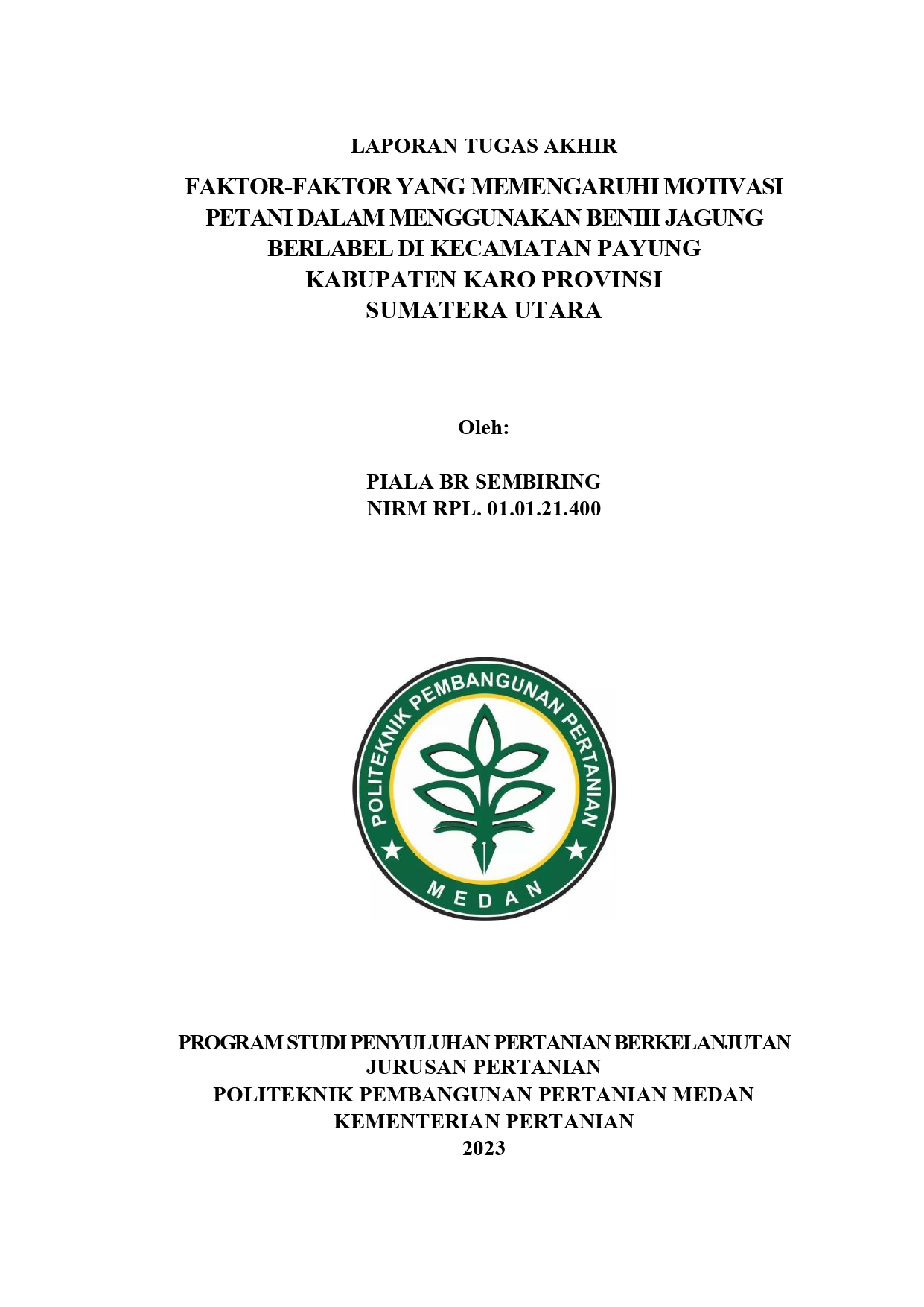 Piala Br Sembiring, Nirm RPL 01.01.21.400. Faktor-faktor yang mempengaruhi motivasi petani dalam menggunakan benih jagung berlabel di Kecamatan Payung Kabupaten Karo. Tujuan dari pengkajian ini adalah mengetahui tingkat motivasi petani dan faktor-faktor yang memengaruhi motivasi petani dalam menggunakan benih jagung berlabel. Pengkajian ini dilaksanakan di Kecamatan Payung Kabupaten Karo pada bulan Oktober 2022 sampai dengan Juli 2023. Metode pengkajian ini yaitu deskripsi kuantitatif dan metode pengumpul data yaitu metode wawancara menggunakan kuesioner, sementara metode analisis data menggunakan skala likert dan regresi linear berganda. Hasil pengkajian menunjukkan bahwa tingkat persentasi motivasi petani dalam menggunakan benih jagung berlabel tergolong sangat tinggi yaitu 86,76%. Secara simultan variabel luas lahan, modal, intensitas penyuluh, dan tersedianya informasi mempengaruhi motivasi petani dalam menggunakan benih jagung berlabel. Secara parsial variabel yang berpengaruh sangat nyata terhadap motivasi petani dalam menggunakan benih jagung berlabel luas lahan, modal, intensitas penyuluh, dan tersedianya informasi