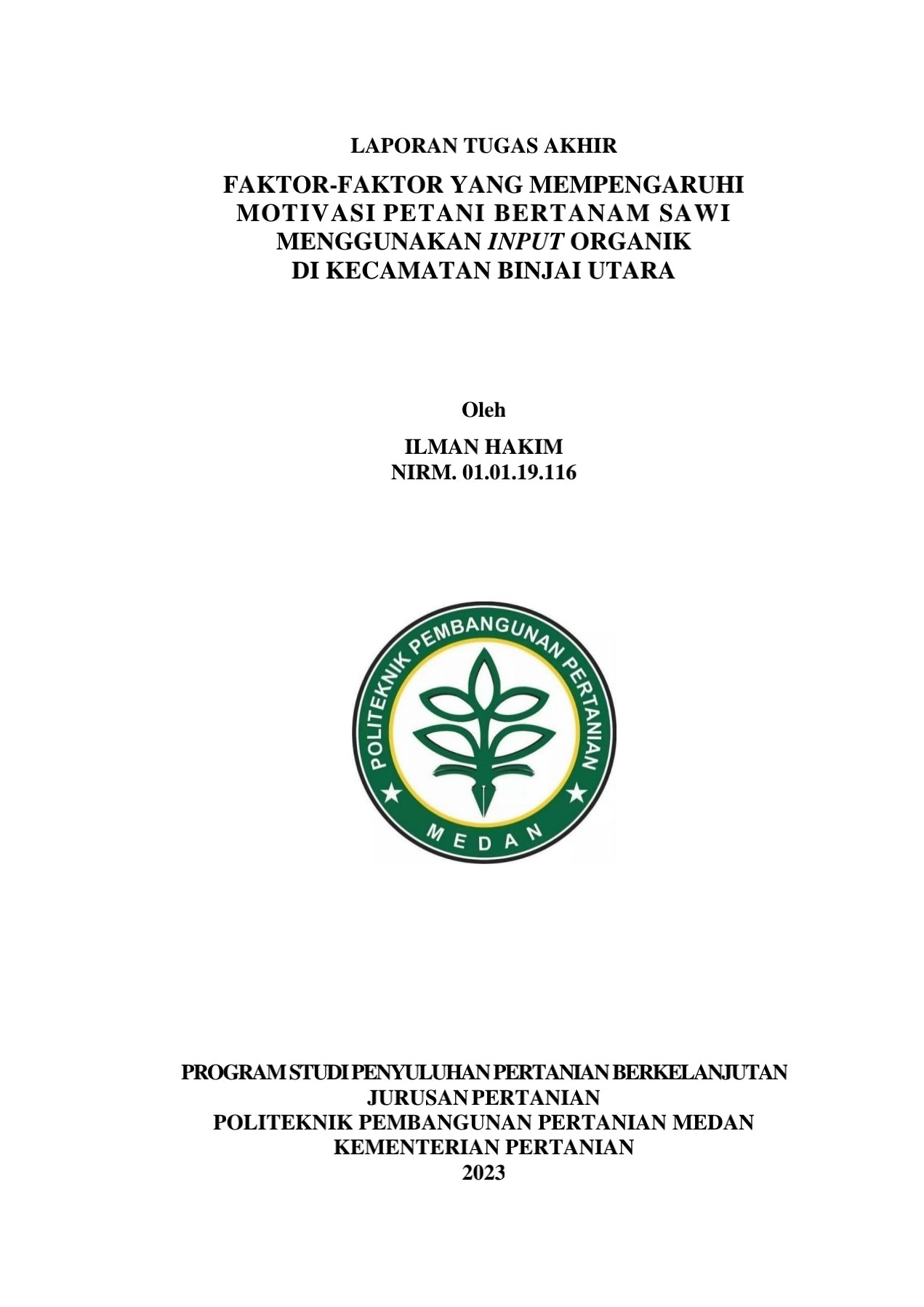 Ilman Hakim, Nirm 01.01.19.116. Faktor-Faktor yang Mempengaruhi Motivasi Petani Bertanam Sawi Menggunakan Input Organik di Kecamatan Binjai Utara. Tujuan dari pengkajian ini untuk menganalisis motivasi petani dan faktor-faktor yang mempengaruhi motivasi petani bertanam sawi menggunakan input organik. Pengkajian ini dilakukan pada bulan Februari sampai dengan bulan Juli tahun 2023. Metode pengumpulan data yaitu metode observasi, kuesioner, wawancara dan dokumentasi. Sementara metode analisis data menggunakan skala Likert dan regresi linear berganda. Hasil pengkajian menunjukkan bahwatingkat motivasi petani bertanam sawi menggunakn input organik tergolong tinggi, dengan persentase tingkat motivasi sebesar 84,05%. Hasil regresi linear berganda terhadap faktor-faktor yang mempengaruhi motivasi petani diperoleh persamaan sebagai berikut Y=1,857 + 0,479X1 + 0,853X2 - 0,328X3 + 0,452X4 + 0,757X5 - 0,515X6 + 0,303X7 + 0,475X8. Uji lanjutan menggunakan t-hitung menunjukkan bahwa umur, luas lahan, pengalaman bertani, teknis, peran penyuluh dan lingkungan sosial memiliki pengaruh yang signifikan dengan nilai t-hitung lebih besar daripada t-tabel. Sedangkan pendapatan dan dukungan pemerintah tidak berpengaruh dengan t-hitung lebih kecil daripada t-tabel.