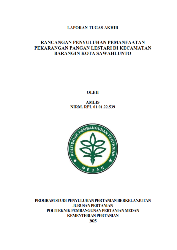 Amlis. NIRM: RPL 01.01.22.539. Rancangan Penyuluhan Pertanian Pemanfaatan Pekarangan Pangan Lestari di Kecamatan Barangin Kota Sawahlunto. Tujuan rancangan ini adalah untuk mengetahui pemanfaatan pekarangan pangan lestari di Kecamatan Barangin Kota Sawahlunto, untuk mengetahui desain rancangan penyuluhan tentang pemanfaatan pekarangan pangan lestari di Kecamatan Barangin Kota Sawahlunto, dan untuk mengetahui tingkat penerimaan petani terhadap rancangan penyuluhan pemanfaatan pekarangan pangan lestari di Kecamatan Barangin Kota Sawahlunto. Penelitian ini dilaksanakan di Kecamatan Barangin Kota Sawahlunto pada bulan November 2023 sampai dengan bulan Mei 2024. Metode pengumpulan data yaitu, observasi dan wawancara yang diukur menggunakan kuesioner, sementara metode analisis menggunakan metode rancangan penyuluhan. Rancangan penyuluhan disusun melalui Lembar Persiapan Menyuluh (LPM), yang menjadi sasaran yakni wanita tani yang bertujuan untuk meningkatkan pengetahuan wanita tani dalam pemanfaatan pekarangan lestari sesuai anjuran dari 20% menjadi 50%, materi yang digunakan yaitu “Pemanfaatan pekarangan lestari”, dan metode yang digunakan adalah ceramah, diskusi, dan demonstrasi cara, serta penggunaan media berupa folder dan benda sesungguhnya. Hasil validasi rancangan penyuluhan, sasaran penyuluhan, materi penyuluhan, metode penyuluhan, media, volume, lokasi, biaya, dan pelaksanaan penyuluhan semuanya berada pada kategori efektif yaitu masing-masing secara berurut adalah 81,07%, 82,20%, 80,79%, 82,99%, 84,79%, 83,49%,82,25%, 78,87%, dan 80,77%