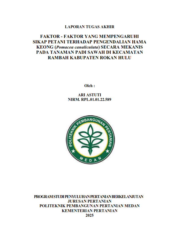 Ari Astuti, NIRM.RPL.01.01.21.589. Faktor - Faktor yang Mempengaruhi Sikap Petani terhadap Pengendalian Hama Keong (Pomacea canaliculata) Secara Mekanis pada Tanaman Padi Sawah di Kecamatan Rambah Kabupaten Rokan Hulu. Tujuan dari pengkajian ini adalah untuk menganalisis tingkat sikap petani terhadap pengendalian hama keong mas secara mekanis pada tanaman padi sawah di Kecamatan Rambah dan faktor-faktor apa saja yang mempengaruhi sikap petani terhadap pengendalian hama keong mas secara mekanis pada tanaman padi sawah di Kecamatan Rambah. Pengkajian ini dilaksanakan pada bulan November 2023. Metode pengumpulan data yang digunakan terdiri dari metode observasi, wawancara dan kuesioner yang telah diuji validitas dan reliabilitasnya. Metode analisis data yang digunakan yaitu analisis deskriptif kuantitatif dan regresi linear berganda. Hasil pengkajian menunjukkan bahwa Tingkat sikap petani terhadap pengendalian hama keong mas secara mekanis pada tanaman padi sawah di Kecamatan Rambah termasuk kategori tinggi dengan persentase 70,35%. Hasil uji regresi linear berganda atas faktor-faktor yang mempengaruhi sikap petani terhadap pengendalian hama keong mas secara mekanis pada tanaman padi sawah di Kecamatan Rambah diperoleh persamaan Y = 9,966 + 0,103X1 + 0,125X2 +0,306X3 + 0,424X4. Hasil uji secara parsial menunjukkan bahwa ketersediaan sarana dan prasarana, kebijakan pemerintah, dan peran penyuluh berpengaruh signifikan dalam pengendalian hama keong mas secara mekanis pada tanaman padi sawah..