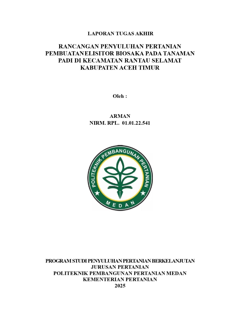 Arman. NIRM. RPL. 01.01.22.541. Rancangan Penyuluhan Pertanian Pembuatan Elisitor Biosaka pada Tanaman Padi di Kecamatan Rantau Selamat Kabupaten Aceh Timur. Pengkajian ini bertujuan untuk mendesain rancangan penyuluhan pertanian serta untuk menganalisis tingkat penerimaan petani (materi, metode, media, volume, lokasi, waktu, biaya penyuluhan pertanian) terhadap pembuatan elisitor biosaka di Kecamatan Rantau Selamat Rantau Selamat Kabupaten Aceh Timur. Pengkajian ini dilaksanakan pada September – Desember 2024 di Kecamatan Rantau Selamat. Metode Pengkajian yang digunakan adalah wawancara dan survei yang dianalisis menggunakan Teknik deskriptif kuantitatiif. untuk mengevaluasi tingkat penerimaan petani terhadap rancangan penyuluhan, meliputi materi, metode, media, volume, lokasi, waktu, dan biaya penyuluhan. Hasil pengkajian ini menunjukkan bahwa tingkat penerimaan petani terhadap rancangan penyuluhan pembuatan elisitor biosaka pada tanaman padi di Kecamatan Rantau Selamat Kabupaten Aceh Timur tergolong Sangat Efektif (80,3%). Sedangkan, tingkat penerimaan petani terhadap metode penyuluhan termasuk dalam kategori sangat efektif (83,3%), pada media penyuluhan termasuk kategori efektif (79,2%), volume penyuluhan tergolong efektif (76,6%), Lokasi penyuluhan termasuk kategori sangat efektif (84,5%), waktu penyuluhan tergolong sangat efektif (83%), biaya penyuluhan tergolong sangat efektif (82%) materi penyuluhan tergolong sangat efektif (80,9%).