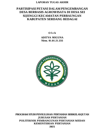 Aditya Wiguna, NIRM 010121235. Partisipasi Petani Dalam Pengembangan Desa Berbasis Agrowisata di Desa Sei Sijenggi Kecamatan Perbaungan Kabupaten Serdang Bedagai. Tujuan pengkajian ini adalah menganalisis tingkat partisipasi petani dan faktor-faktor yang memengaruhi tingkat partisipasi petani dalam pengembangan desa berbasis agrowisata. Pengkajian dilakukan di Desa Sei Sijenggi Kecamatan Perbaungan Kabupaten Serdang Bedagai pada bulan April sampai dengan Mei 2025. Metode pengkajian yang digunakan adalah metode deskriptif kuantitatif dengan menggunakan kuesioner dalam pengumpulan data. Teknik yang digunakan dalam analisis data menggunakan pengujian outer model, inner model dan pengujian hipotesis dengan menggunakan bantuan alat analisis SEM-PLS. Hasil penelitian menunjukkan tingkat partisipasi petani dalam pengembangan desa berbasis agrowisata tergolong tinggi (72,13%), faktor-faktor yang memengaruhi tingkat partisipasi petani yaitu motivasi, dukungan pemerintah, sarana dan prasarana dengan faktor motivasi yang paling dominan berpengaruh terhadap tingkat partisipasi petani, sedangkan faktor peran penyuluh berpengaruh tidak signifikan terhadap tingkat partisipasi petani dalam pengembangan desa berbasis agrowisata. Peningkatan partisipasi petani dapat dilakukan dengan meningkatkan motivasi petani yaitu menciptakan peluang pendapatan bagi petani melalui diversifikasi pangan menjadi berbagai produk olahan makanan.