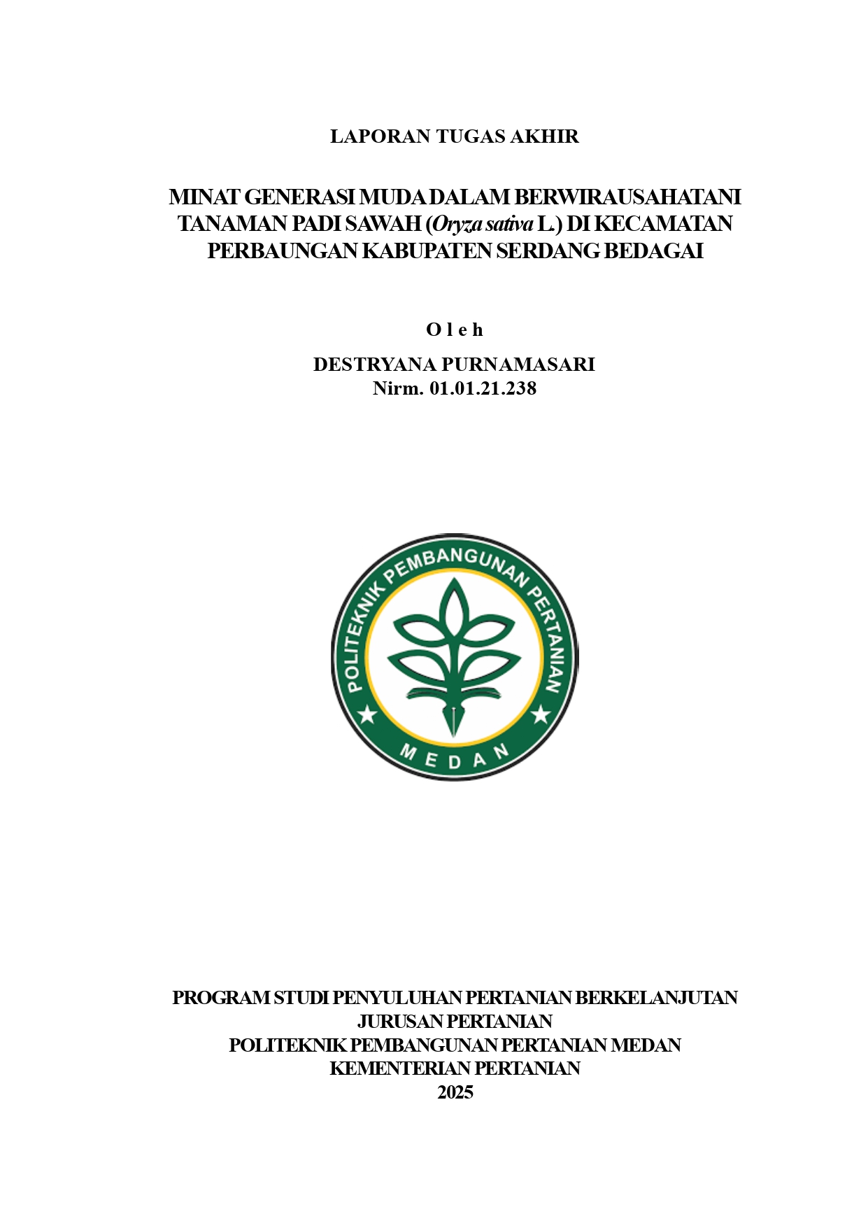 Destryana Purnamasari, NIRM. 01.01.21.238. Sektor pertanian merupakan tulang punggung ketahanan pangan nasional, namun menghadapi tantangan serius akibat menurunnya minat generasi muda dalam berwirausahatani. Minat generasi muda dalam Berwirausahatani Tanaman Padi Sawah di Kecamatan Perbaungan Kabupaten Serdang Bedagai. Penelitian ini bertujuan untuk menganalisis tingkat minat generasi muda dalam berwirausahatani tanaman padi sawah serta faktor faktor yang mempengaruhi minat generasi muda dalam berwirausahatani tanaman padi sawah di Kecamatan Perbaungan Kabupaten Serdang Bedagai. Penelitian ini dilaksanakan di Kecamatan Perbaungan Kabupaten Serdang Bedagai pada bulan April-Mei 2025. Penelitian ini menggunakan pendekatan deskriptif kuantitatif dengan teknik analisis Structural Equation Modeling-Partial Least Square (SEM PLS) yang diolah menggunakan software Smart-PLS. Responden diambil menggunakan metode Cochran dan Convenience Sampling sebanyak 100 responden berusia 20-29 tahun. Hasil penelitian menunjukkan bahwa tingkat minat generasi muda tergolong sedang dengan persentase 67,0%. Variabel pendidikan, pendapatan, dan lingkungan keluarga berpengaruh signifikan terhadap minat generasi muda dalam berwirausahatani tanaman padi sawah di Kecamatan Perbaungan Kabupaten Serdang Bedagai, sedangkan variabel yang tidak berpengaruh signifikan adalah lingkungan sosial.