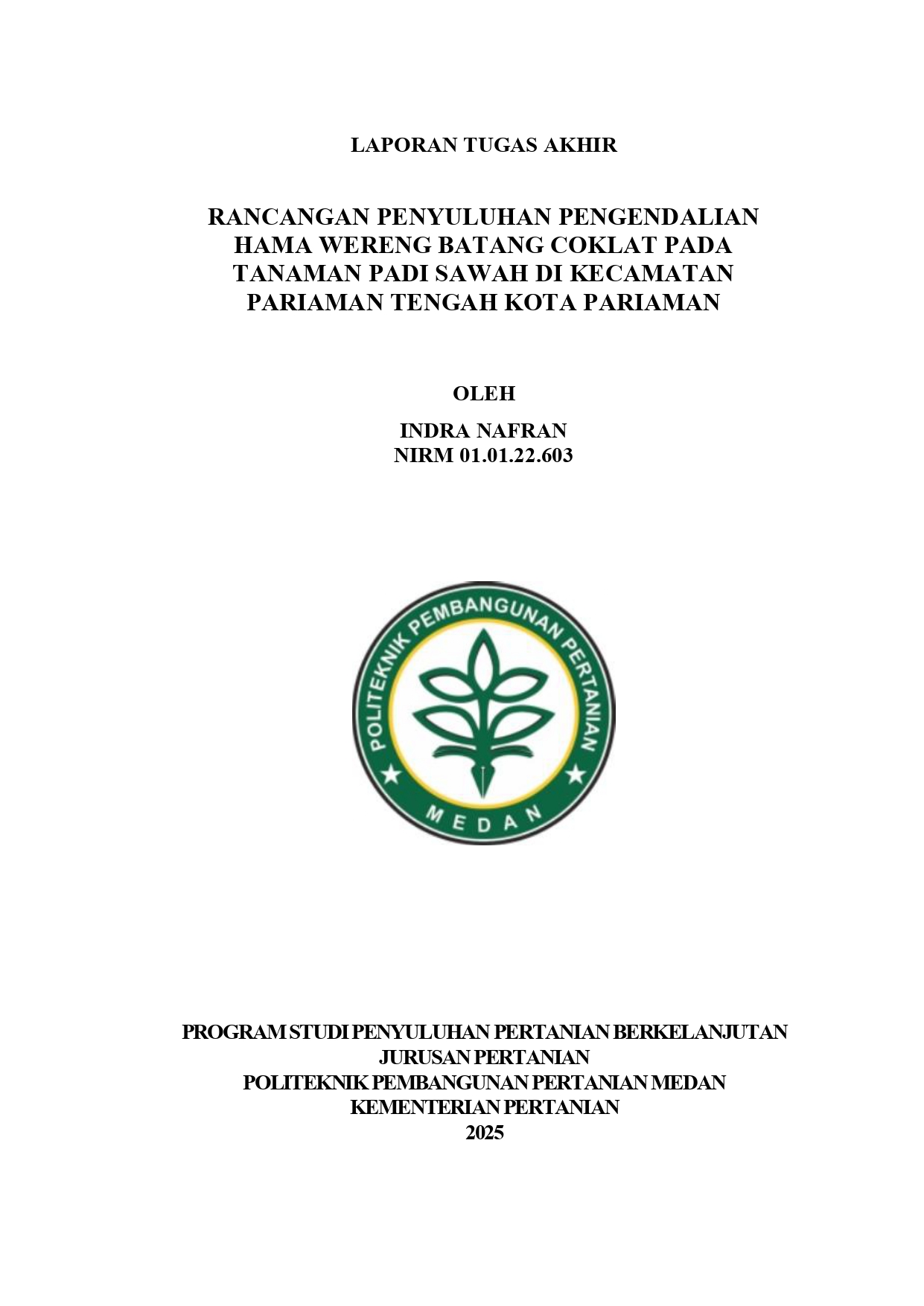 Indra Nafran. NIRM. RPL 01.01.22.603. Rancangan Penyuluhan Pengendalian Hama Wereng Batang Coklat pada Tanaman Padi Sawah di Kecamatan Pariaman Tengah Kota Pariaman. Tujuan rancangan ini adalah untuk mengetahui rancangan penyuluhan pengendalian hama wereng batang coklat pada tanaman padi sawah di Kecamatan Pariaman Tengah Kota Pariaman, untuk mengetahui desain rancangan penyuluhan pengendalian hama wereng batang coklat pada tanaman padi sawah di Kecamatan Pariaman Tengah Kota Pariaman, dan untuk mengetahui tingkat penerimaan petani terhadap rancangan penyuluhan pengendalian hama wereng batang coklat pada tanaman padi sawah di Kecamatan Pariaman Tengah Kota Pariaman. Penelitian ini dilaksanakan di Kecamatan Pariaman Tengah Kota Pariaman pada bulan November 2023 sampai dengan bulan November 2024. Metode pengumpulan data yaitu, observasi dan wawancara yang diukur menggunakan kuesioner, sementara metode analisis menggunakan metode rancangan penyuluhan. Rancangan penyuluhan disusun melalui Lembar Persiapan Menyuluh (LPM), yang menjadi sasaran yakni petani yang melakukan budidaya tanaman padi sawah yang bertujuan untuk meningkatkan pengetahuan petani dalam pengendalian hama wereng batang coklat pada tanaman padi sawah sesuai anjuran dari 20% menjadi 50%, materi yang digunakan yaitu “Pengendalian Hama Wereng Batang Coklat pada Tanaman Padi Sawah”, dan metode yang digunakan adalah ceramah, diskusi, dan demonstrasi cara, serta penggunaan media berupa folder dan benda sesungguhnya. Hasil validasi rancangan penyuluhan, sasaran penyuluhan, materi penyuluhan, metode penyuluhan, media, volume, lokasi, biaya, dan pelaksanaan penyuluhan semuanya berada pada kategori efektif yaitu masing masing secara berurut adalah 83,38%, 83,79%, 83,03%, 85,86%, 86,76%, 85,45%, 83,66%, 80,62%, dan 81,66%, Tingkat penerimaan petani terhadap seluruh kegiatan penyuluhan adalah 84,88%%.