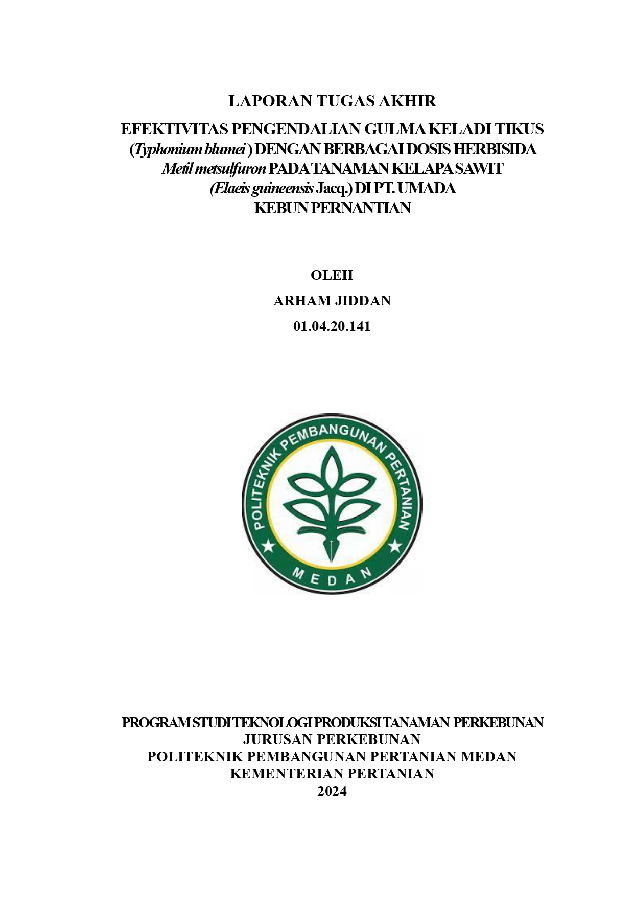 Laporan Tugas Akhir Efektivitas Pengendalian Gulma Keladi Tikus (Typhonium Blumei ) Dengan Berbagai Dosis Herbisida Metil Metsulfuron Pada Tanaman Kelapa Sawit (Elaeis Guineensis Jacq.) Di Pt. Umada Kebun Pernantian