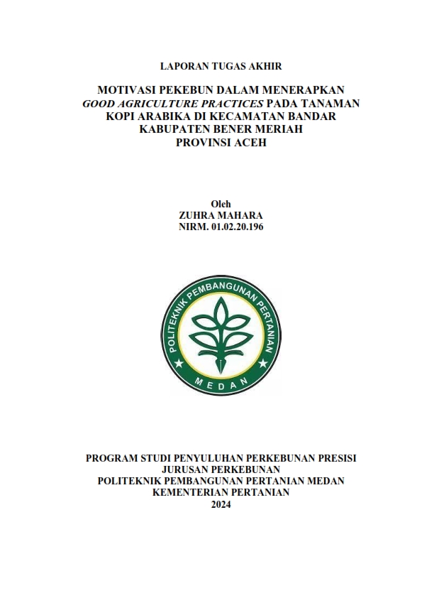 Zuhra Mahara, NIRM 01.02.20.196. Motivasi Pekebun dalam Menerapkan Good Agriculture Practices pada Tanaman Kopi Arabika di Kecamatan Bandar Kabupaten Bener Meriah Provinsi Aceh. Tujuan dari penelitian ini adalah untuk menganalisis tingkat motivasi dan faktor-faktor yang memengaruhi motivasi pekebun dalam menerapkan Good Agriculture Practice pada tanaman kopi Arabika. Penelitian ini dilaksanakan pada bulan April sampai dengan bulan Mei 2024. Metode pengumpulan data yaitu yang terdiri dari observasi, wawancara, dan kuesioner yang telah diuji validitas dan reliabilitas. Selanjutnya metode analisis data menggunakan analisis skala likert dan analisis regresi linear berganda. Hasil penelitian menunjukkan bahwa tingkat motivasi pekebun dalam menerapkan Good Agriculture Practices pada tanaman kopi Arabika tergolong kategori tinggi dengan persentase 83,48%. Hasil analisis regresi linear berganda terhadap faktor-faktor yang memengaruhi motivasi pekebun diperoleh persamaan sebagai berikut Y=58,462+0,008X1+3,129X2-2,143X3-0,618X4+ 1,265X5 + 1,406X6 + 1,262X7 + e. Uji F menunjukkan bahwa variabel-variabel bebas umur (X1), pendapatan usahatani (X2), luas lahan (X3), jumlah tanggungan (X4), pendidikan non formal (X5), kemudahan dalam penerapan (X6) dan peran penyuluh (X7) berpengaruh signifikan secara simultan terhadap variabel terikat motivasi pekebun (Y). Selanjutnya uji t menunjukkan bahwa variabel pendapatan usahatani, pendidikan non formal, kemudahan dalam penerapan dan peran penyuluh memiliki pengaruh yang signifikan terhadap (Y). Sedangkan variabel umur, luas lahan dan jumlah tanggungan tidak berpengaruh terhadap (Y).