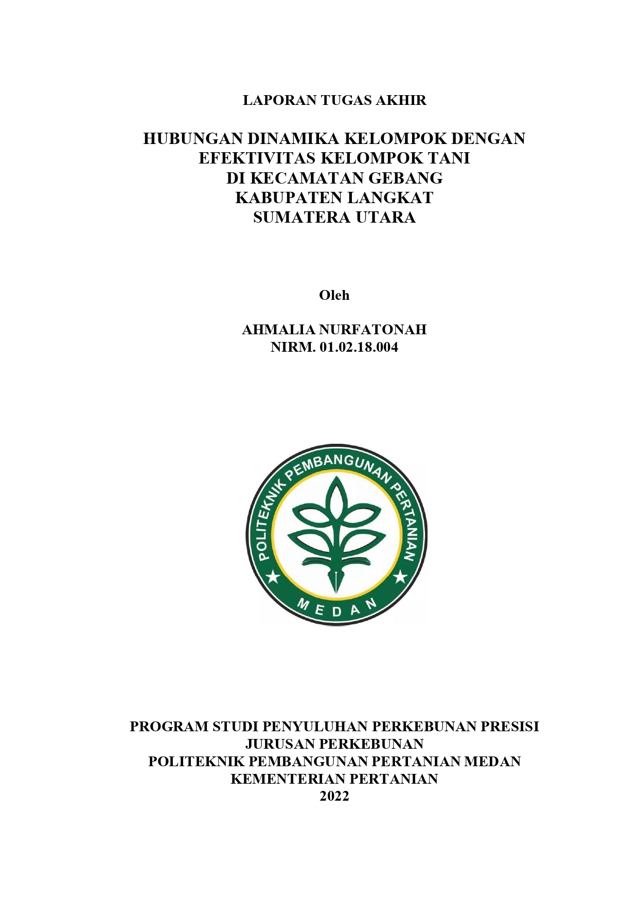 Ahmalia Nurfatonah, NIRM. 01.02.18.004. Hubungan Dinamika Kelompok dengan Efektivitas Kelompok Tani di Kecamatan Gebang Kabupaten Langkat Provinsi Sumatera Utara. Pengkajian ini bertujuan untuk mengkaji tingkat dinamika kelompok tani, tingkat efektivitas kelompok tani, dan hubungan dinamika kelompok dengan efektivitas kelompok tani. Penelitian ini dilaksanakan di Kecamatan Gebang, Kabupaten Langkat Sumatera Utara pada April sampai dengan Juni 2022. Metode pengkajian yang digunakan adalah deskriptif kuantitatif. Pengumpulan data yaitu dengan wawancara menggunakan kuesioner yang telah diuji validitas dan reliabilitas, sementara analisis data menggunakan skala Likert dan korelasi Rank Spearmen. Hasil penelitian menunjukkan bahwa tingkat dinamika kelompok dalam kelompok tani berada pada kategori tinggi yaitu 79,15%, tingkat efektivitas kelompok tani juga berada pada kategori tinggi yaitu 81,74%, sementara hasil korelasi Rank Spearman antara hubungan dinamika kelompok dengan efektivitas kelompok tani menunjukkan adanya hubungan yang signifikan antara tujuan kelompok dengan nilai correlation coefficient 0,766 (kategori hubungan kuat), struktur kelompok dengan nilai correlation coefficient 0,242 (kategori hubungan sangat lemah/dianggap tidak berkorelasi), fungsi tugas dengan nilai correlation coefficient 0,331 (kategori hubungan cukup), pengembangan dan pembinaan kelompok dengan nilai correlation coefficient 0,381 (kategori hubungan cukup), kekompakan kelompok dengan nilai correlation coefficient 0,328 (kategori hubungan cukup), dan suasana kelompok dengan nilai correlation coefficient 0,319 (kategori hubungan cukup) dengan efektivitas kelompok tani.