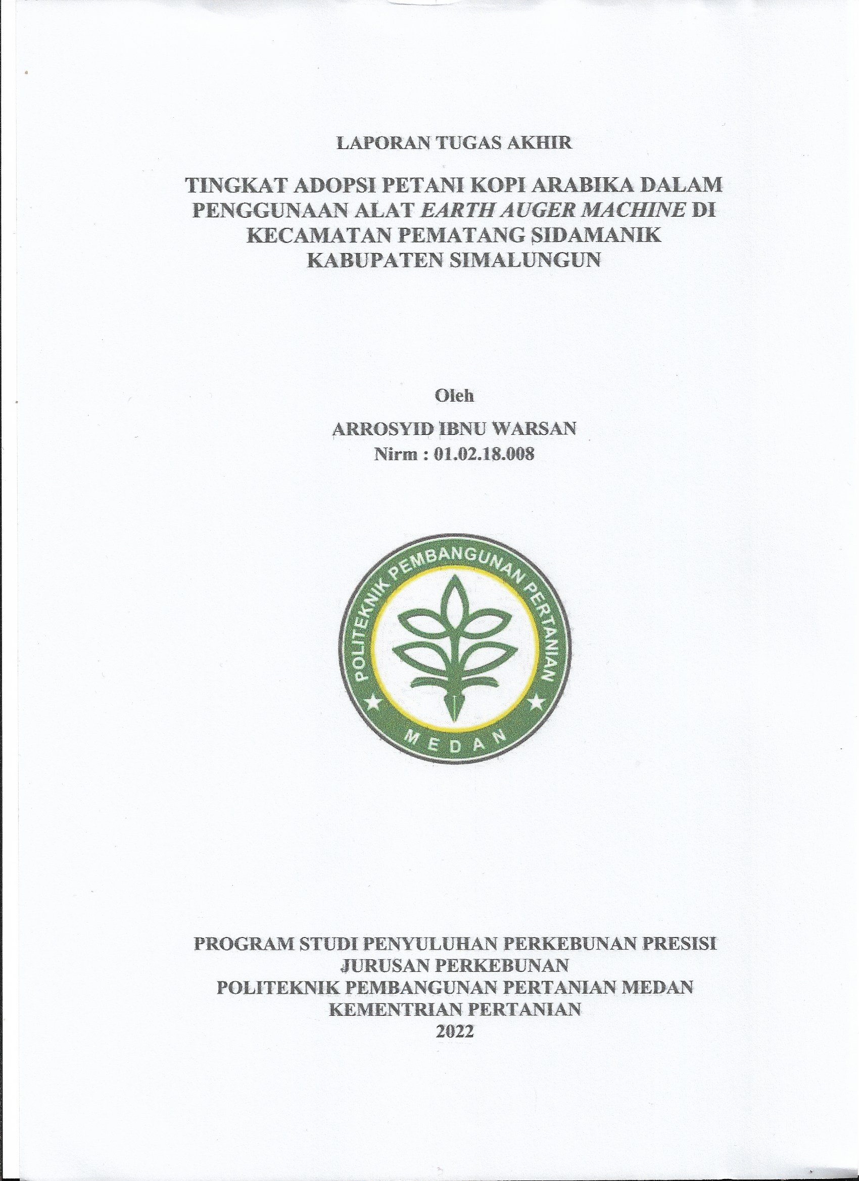 ARROSYID IBNU WARSAN, 01.02.18.008. Tingkat adopsi petani kopi arabika dalam penggunaan alat earth auger machine di Kecamatan Pematang Sidamanik Kabupaten Simalungun. Pengkajian ini bertujuan untuk mengkaji tingkat adopsi petani kopi dalam penggunaan alat earth auger machine dan mengkaji faktor-faktor apa saja yang mempengaruhi tingkat adopsi petani kopi dalam penggunaan alat earth auger machine di Kecamatan Pematang Sidamanik Kabupaten Simalungun. Metode dalam pengkajian ini adalah deskriptif kuantitatif dilakukan dengan wawancara, observarsi, dan pengisian kuesioner. Pelaksanaan pengkajian dilakukan di Desa Pematang Sidamanik, Desa Bandar Manik, dan Desa Sait Buttu Saribu Kecamatan Pematang Sidamanik. Diketahui hasil pengkajian menunjukan bahwa tingkat adopsi petani kopi dalam penggunaan alat earth auger machine adalah sebesar 88,7% dengan kategori sangat tinggi, sementara dari hasil analisis regresi linear berganda menyimpulkan bahwa secara serempak keseluruhan variabel memiliki pengaruh signifikan terhadap tingkat adopsi penggunaan alat earth auger machine. Sedangkan secara parsial, variabel umur (X1), luas lahan (X3), sifat inovasi (X5), tingkat kosmopolitan (X7) dan peran fungsi kelompok tani (X8) mempengaruhi tingkat adopsi petani dalam penggunaan alat earth auger machine dan variabel tingkat pendidikan (X2), pengalaman berusaha tani (X4) dan ketersediaan informasi (X6) tidak mempengaruhi tingkat adopsi petani dalam penggunaan alat earth auger machine.