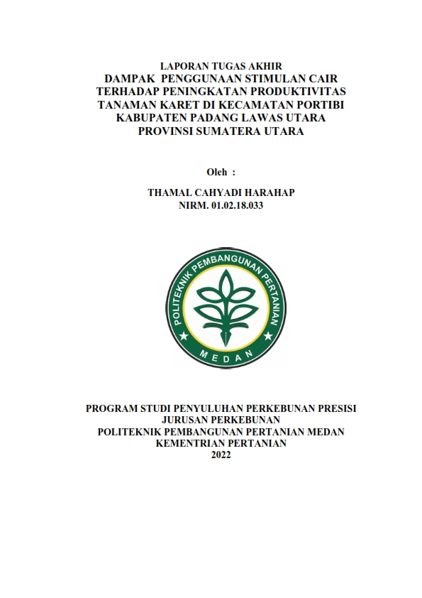 Thamal Cahyadi Harahap, NIRM 01.02.18.033. Dampak Penggunaan Stimulan Cair Terhadap Peningkatan Produktivitas Tanaman Karet di Kecamatan Portibi Kabupaten Padang Lawas Utara. Tujuan dilakukannya penelitian ini adalah untuk mengkaji tingkat dampak penggunaan stimulan cair serta mengkaji faktor-faktor apa saja yang mempengaruhi dampak penggunaan stimulan cair terhadap peningkatan produktivitas tanaman karet di Kecamatan Portibi. Metode yang digunakan dalam pengkajian ini adalah analisis kuantitatif deskriptif dengan pengumpulan data menggunakan kuesioner yang dibagikan kepada responden sebanyak 67 orang yang telah diuji validitas dan reliabilitas sebelumnya. Analisis data yang digunakan untuk melihat tingkat dampak penggunaan stimulan cair menggunakan Skala Likert sedangkan untuk melihat faktor-faktor apa saja yang mempengaruhi dampak penggunaan stimulan cair menggunakan Analisis Regresi Linier Berganda. Hasil penelitian menunjukkan tingkat dampak penggunaan stimulan cair terhadap peningkatan produktivitas tanaman karet di Kecamatan Portibi 54% dan dikategorikan sedang. Secara simultan pengalaman petani, luas lahan, harga karet, dan lingkungan masyarakat berpengaruh nyata terhadap dampak penggunaan stimulan cair. Secara parsial lingkungan masyarakat berpengaruh nyata terhadap dampak penggunaan stimulan cair. Sedangkan pengalaman petani, luas lahan dan harga karet tidak berpengaruh terhadap dampak penggunaan stimulan cair.