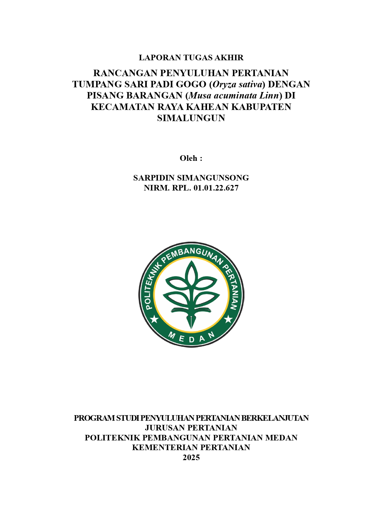 Sarpidin Simangunsong NIRM. RPL.01.01.22.627. Jurusan Pertanian Program Studi Penyuluhan Pertanian Berkelanjutan.” Rancangan Penyuluhan Pertanian Tumpang Sari Padi Gogo (Oryza sativa) dengan Pisang Barangan (Musa acuminata Linn) di Kecamatan Raya Kahean Kabupaten Simalungun”. Tujuan dari penelitian ini adalah untuk merancang kegiatan penyuluhan tentang tumpang sari padi gogo dengan pisang barangan (materi, metode, media, volume, lokasi, waktu, biaya penyuluhan pertanian) di Kecamatan Raya Kahean untuk mengetahui tingkat penerimaan petani terhadap rancangan penyuluhan tumpang sari padi gogo dengan pisang barangan. Penelitian ini dilaksanakan di Kecamatan Raya Kahean, Kabupaten Simalungun pada bulan April sampai dengan bulan Juli tahun 2024. Metode pengumpulan data yang digunakan yaitu data primer yang dilakukan dengan kuesioner dan wawancara terhadap petani dan data sekunder yang dikumpulkan dari pihak ketiga atau literatur terdahulu, sementara metode analisis data menggunakan skala likert. Metode yang digunakan yaitu ceramah diskusi dan demonstrasi cara, dan untuk media yang digunakan yaitu berupa leaflet, volume penyampaian materi dilaksanakan sebanyak 1 kali pertemuan, lokasi pelaksanaan dilakukan di rumah ketua poktan yang memiliki lahan padi gogo dan pisang barangan, waktu pelaksanaan penyuluhan dilakukan sekitar jam 09.00 WIB s/d 11.00 WIB, dan biaya penyuluhan pertanian berkisan Rp. 200.000. Berdasarkan hasil dari pelaksanaan tugas akhir, tingkat kesesuaian dari rancangan penyuluhan yang dilakukan maka hasilnya adalah sebagai berikut untuk sasaran penyuluhan sebesar 83,59%, materi penyuluhan sebesar 81,69%, metode penyuluhan sebesar 84,67%, media penyuluhan sebesar 89,22%, volume penyuluhan sebesar 86,44%, lokasi penyuluhan sebesar 88,81%, waktu penyuluhan sebesar 88,40%, biaya penyuluhan sebesar 86,84%, dan pelaksana penyuluhan pertanian 84,54%